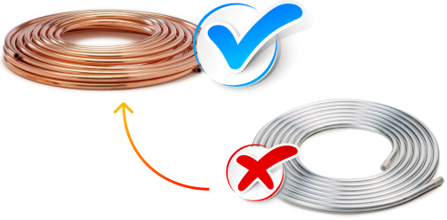 Если есть возможность выбрать материал магистрали, лучше установить медные трубки вместо алюминиевых. Алюминий по сравнению с медью является менее прочным материалом. Из-за перепадов температур или неправильного монтажа места соединения трубок из алюминия быстрее изнашиваются. Это приводит к потере хладагента, из-за чего техника быстро выйдет из строя, а восстановление обойдется очень дорого.